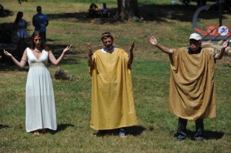 Άνδρες και γυναίκες από την Ελλάδα και το εξωτερικό, που φορούσαν χλαμύδες και σανδάλια, είχαν στο κεφάλι τους φύλλα από κισσό και κρατούσαν αναμμένες δάδες, ασπίδες και δόρατα, ακολούθησαν την πομπή στους δρόμους του Λιτοχώρου, η οποία κατέληξε στο υπαίθριο αμφιθέατρο του χωριού, όπου πραγματοποιήθηκαν αρχαϊκά πολιτισμικά δρώμενα.